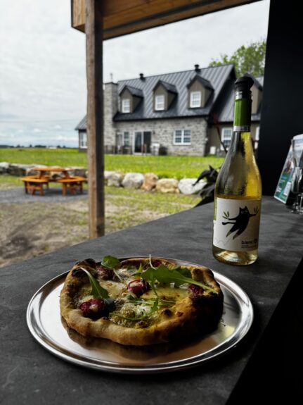 Là, le long de la rivière Richelieu, tout était à faire. Mais, moins de quatre ans après leur installation, ils avaient déjà planté des centaines de plants de kiwiers issus de différents cultivars, s’étaient mis à cultiver la kalette, un légume-feuille «au goût de noisette» qui est un croisement entre le kale et le chou de Bruxelles, et avaient construit leur maison ainsi que le bâtiment qui accueille les clients. Puis, fidèles à leur vision initiale, Claude Gagnon et Nadine Gelly, d’«heureux foodies», comme le dit cette dernière, ont finalement ouvert, en juin 2025, leur Buvette de la Barbotte, en haut de laquelle se trouve leur hébergement pouvant accueillir six personnes, et leur Espace Terroir Commun, pour manger à l’extérieur pendant l’été.